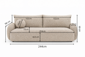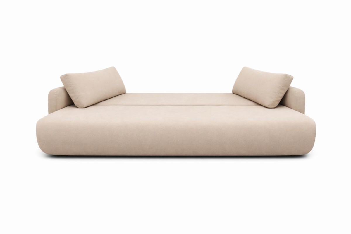 Sofa została zaprojektowana z myślą o ergonomii – szerokie siedzisko, sprężyny faliste oraz miękkie poduchy zapewniają wygodę zarówno podczas siedzenia, jak i snu. Dzięki swojej bryle NUBE wygląda lekko, a jednocześnie jest solidna i funkcjonalna.